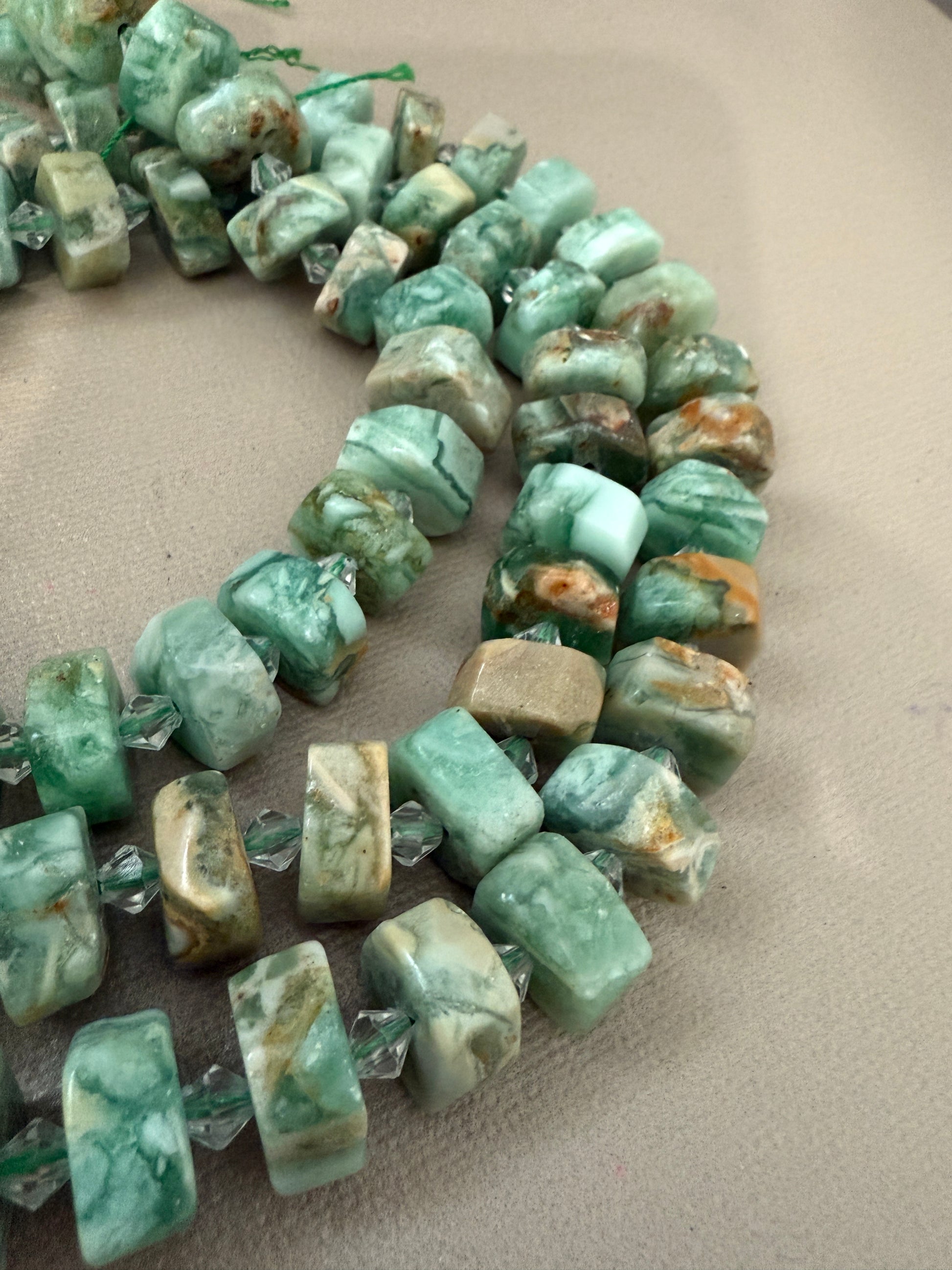 These beautiful beads are made of natural stone with predominant shades of aqua green, white shades and earthy touches in brown and beige. Each bead has an organic cylindrical shape with a gentle polish that highlights the natural veins and textures of the stone. They are interspersed with transparent faceted glass separators, which adds an elegant and modern shine.